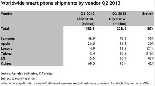 Canalys發(fā)布的報告顯示,今年第二季度,三星和蘋果智能手機出貨量的同比增幅分別達到55%和20%,占據(jù)出貨量排名前兩位;而聯(lián)想、宇龍和LG則分列三到五位。第二季度,中國排名前五的智能手機生產(chǎn)商(聯(lián)想、宇龍酷派、華為、中興和小米)在今年第二季度的出貨量占到了全球總出貨量的20%,去年同期該份額不足15%。
