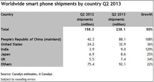 北京時間8月6日消息,據(jù)國外媒體報道,全球著名市場研究機構(gòu)Canalys周一公布了今年第二季度全球智能手機出貨量調(diào)查報告。報告顯示,今年第二季度,全球智能手機出貨量約為2.381億部,同比增幅達到驚人的50%。中國市場的手機銷量目前已占全球手機銷量的20%,這主要得益于中國大批量生產(chǎn)的低價智能手機銷量的猛增。