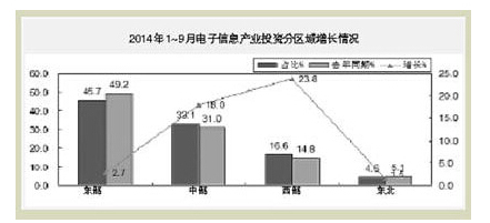 1~9月,電子信息產(chǎn)業(yè)500萬元以上項目完成固定資產(chǎn)投資額8624億元,同比增長10.5%,增速比1~8月回落1.1個百分點(diǎn),比同期工業(yè)投資低3個百分點(diǎn)。其中9月當(dāng)月完成固定資產(chǎn)投資1224億元,同比增長4.2%,增速達(dá)今年以來單月最低水平。1~9月,電子信息產(chǎn)業(yè)新增固定資產(chǎn)3999.5億元,同比增長11.2%,增速高于去年同期5.2個百分點(diǎn),比1~8月提高0.2個百分點(diǎn)。