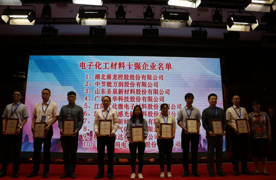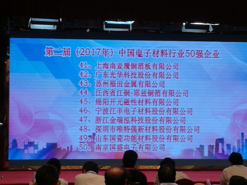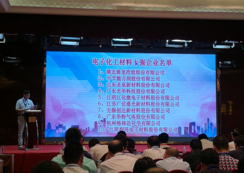 大會(huì)重磅發(fā)布了第二屆(2017年)中國(guó)電子材料五十強(qiáng)企業(yè),以及相關(guān)電子材料專業(yè)十強(qiáng)企業(yè)名單。光華科技憑借在專用電子化學(xué)品領(lǐng)域的突出表現(xiàn),光榮入選中國(guó)電子材料五十強(qiáng),并被評(píng)為電子化工材料十強(qiáng)企業(yè)!