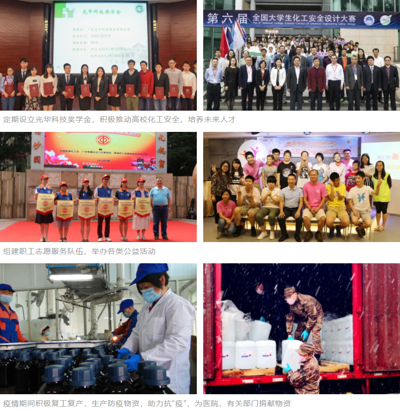 感恩當下,回饋社會。作為一名企業(yè)公民,光華科技深刻意識到所肩負的社會責任,在追求企業(yè)可持續(xù)發(fā)展之際,保護環(huán)境、回饋社會,為股東、員工、合作伙伴、社會及所有利益相關(guān)者創(chuàng)造福祉。一直以來,光華科技積極投身于社會公益事業(yè),組建活躍于社區(qū)的職工志愿服務(wù)團隊,以實際行動擔當社會責任。結(jié)合企業(yè)定位與行業(yè)特性,自2003年起,公司先后在中山大學及華南理工大學等高校設(shè)立光華獎學金,鼓勵學子積極進取、奮發(fā)向上;開展高校實驗室安全管理經(jīng)驗分享。在疫情期間,光華科技積極響應(yīng)中央、省市政府的號召,在做好本單位防疫工作的同時,密切關(guān)注各地防疫重要物資需求情況,積極復工復產(chǎn),捐贈支援前線,助力打好疫情防控阻擊戰(zhàn)……