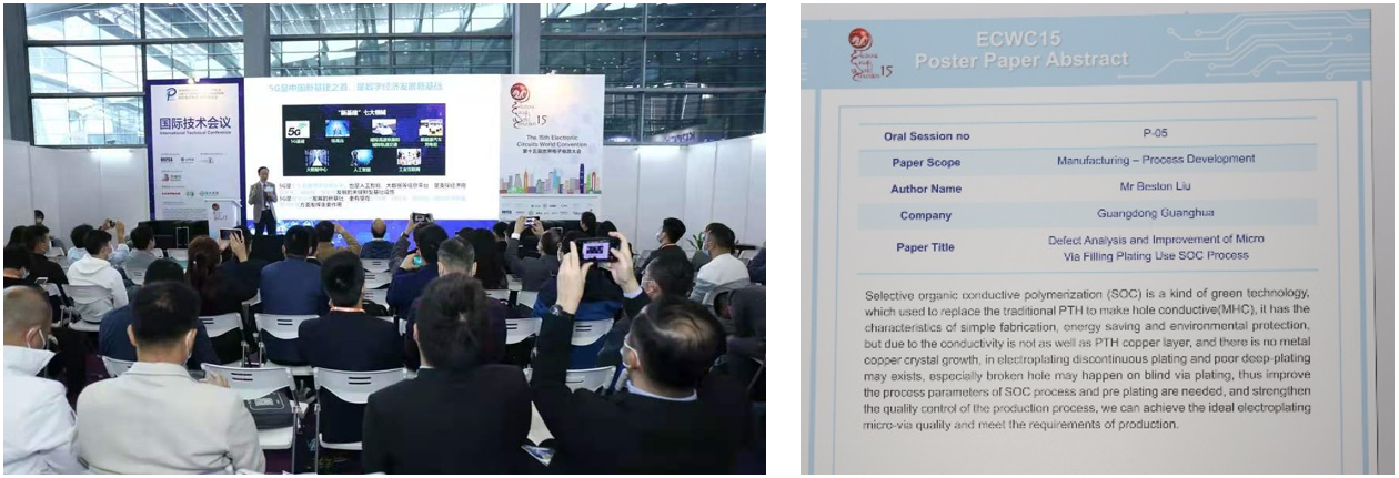 2020國際電子電路(深圳)展覽會不僅展示范圍豐富,更致力于通過行業(yè)分享和趨勢解讀幫助業(yè)內(nèi)人士開拓視野,啟迪思維,舉辦多場高水準創(chuàng)新論壇,增強展會軟實力。同期舉行的第十五屆世界電子電路大會(ECWC15) 會議,匯聚了全球業(yè)界領(lǐng)袖及專家學(xué)者議題全面覆蓋市場及技術(shù)發(fā)展。光華科技技術(shù)中心副總經(jīng)理劉彬云先生論文入選,與參會者對PCB熱點技術(shù)及市場發(fā)展的真知灼見,探討電子電路領(lǐng)域熱門議題、最新技術(shù)發(fā)展和趨勢,助參會者一起把握行業(yè)最新資訊,洞見未來。