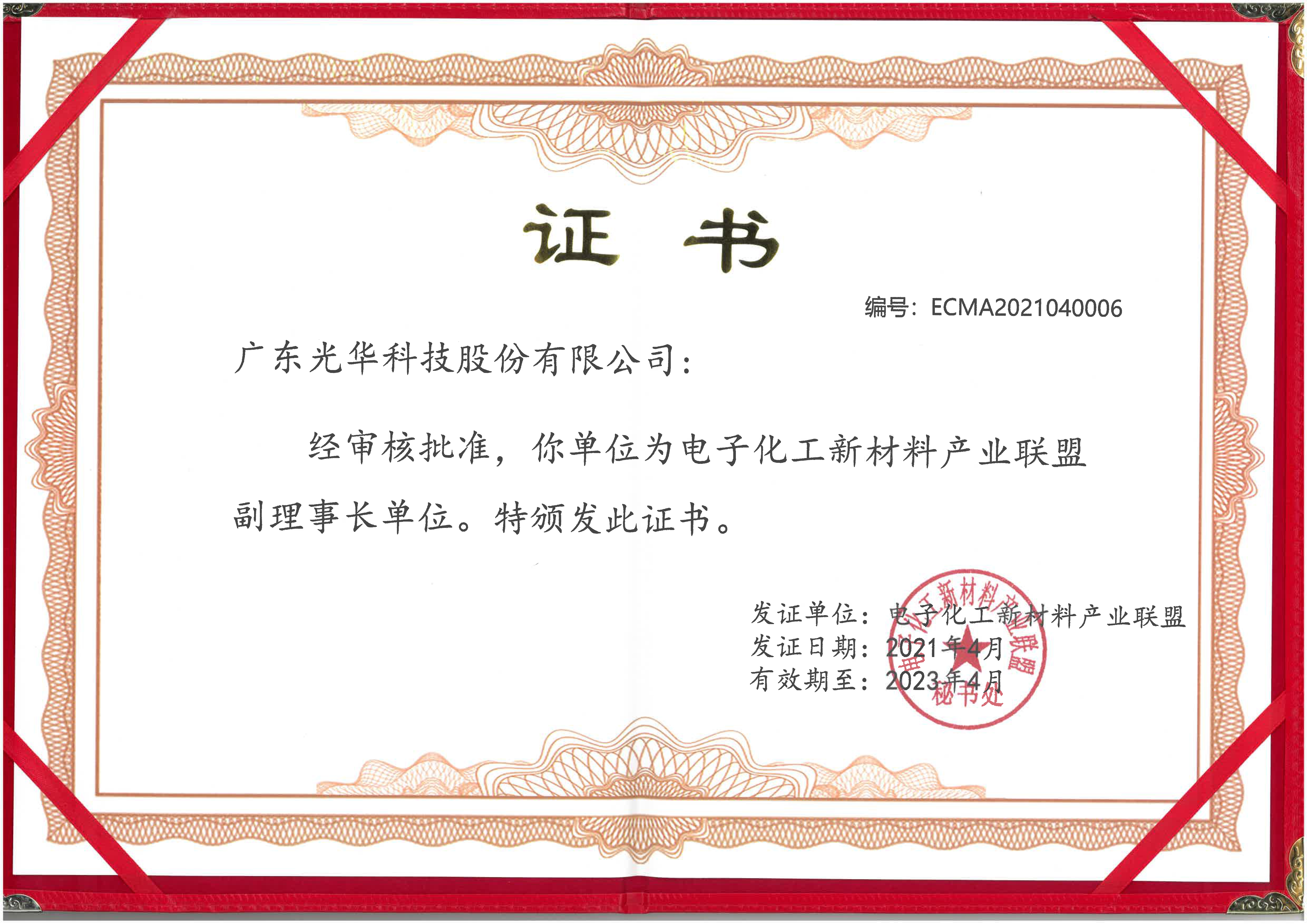 光華科技副理事長(zhǎng)單位證書