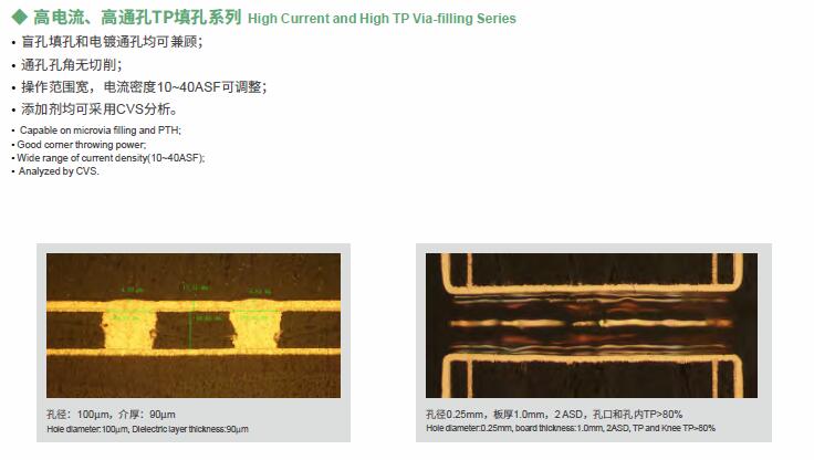 VFP系列是我司新一代填孔藥水,其中VFP08適用于不溶性陽極電鍍填孔,VFP08S適用于可溶性陽極電鍍填孔,均可用于孔徑2~6mil的盲孔填孔,且可達(dá)到較薄面銅,適應(yīng)精細(xì)線路的生產(chǎn),VFP21適用于盲孔填孔和通孔同時(shí)電鍍。